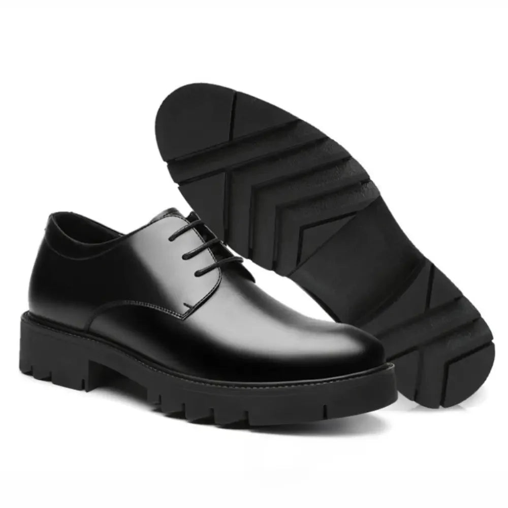 A refined black leather shoe with a sleek, formal aesthetic. This design blends elegance and practicality, offering an 8cm (3" inches) height boost while maintaining a sophisticated and understated look. The Onyx is crafted for those who value timeless style with a discreet edge, making it the perfect choice for formal occasions or business attire.