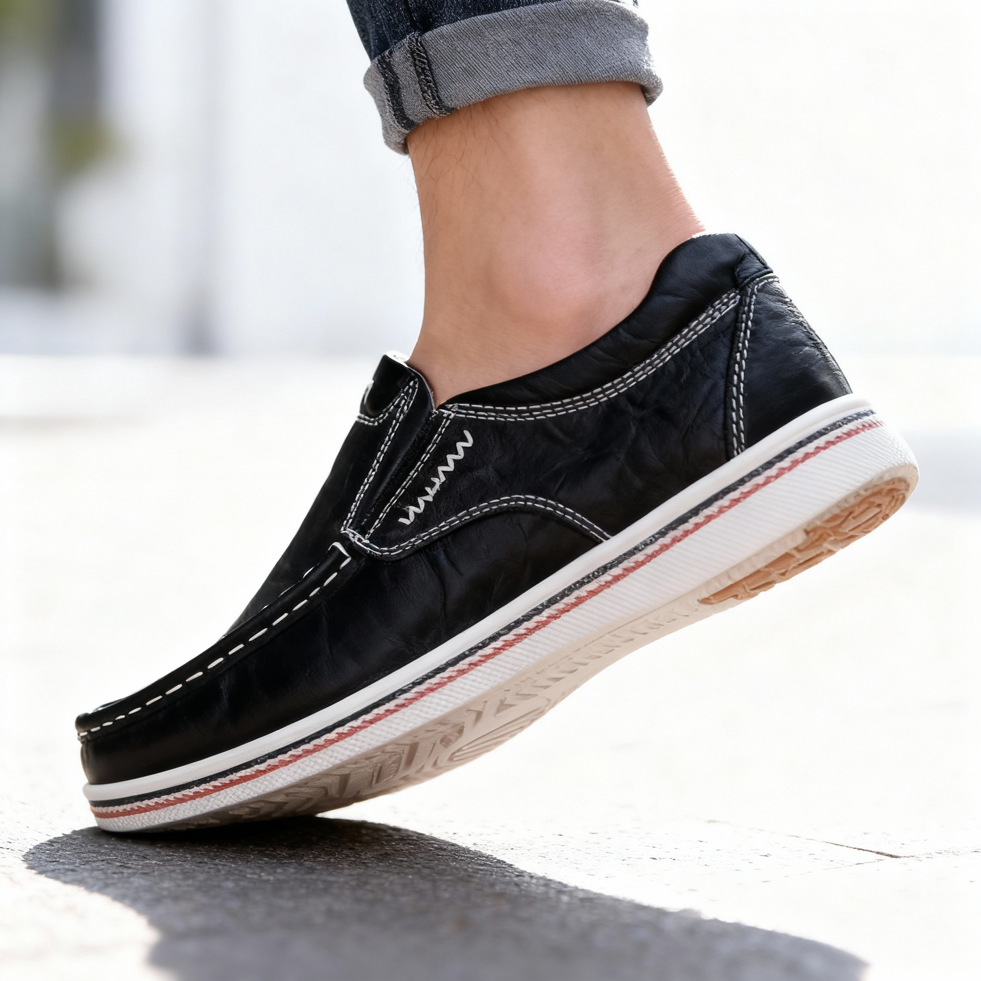 Some shoes talk quiet—these ones have a voice. Built from full-grain leather, they’ve got the clean lines of a loafer with the easy feel of your favorite sneakers. The standout stitching and striped sole make them hard to ignore, and the slip-on fit makes them even harder to take off.